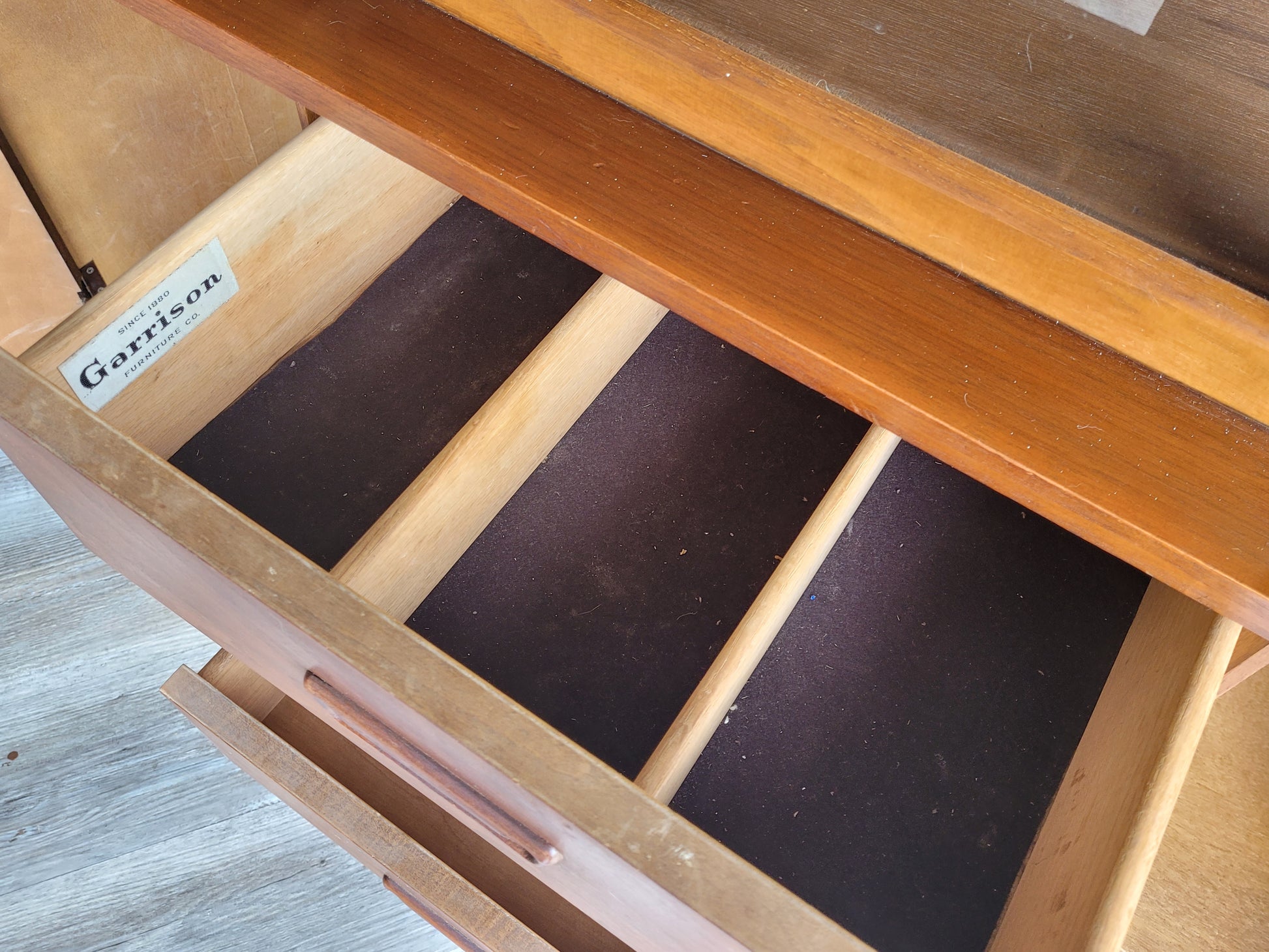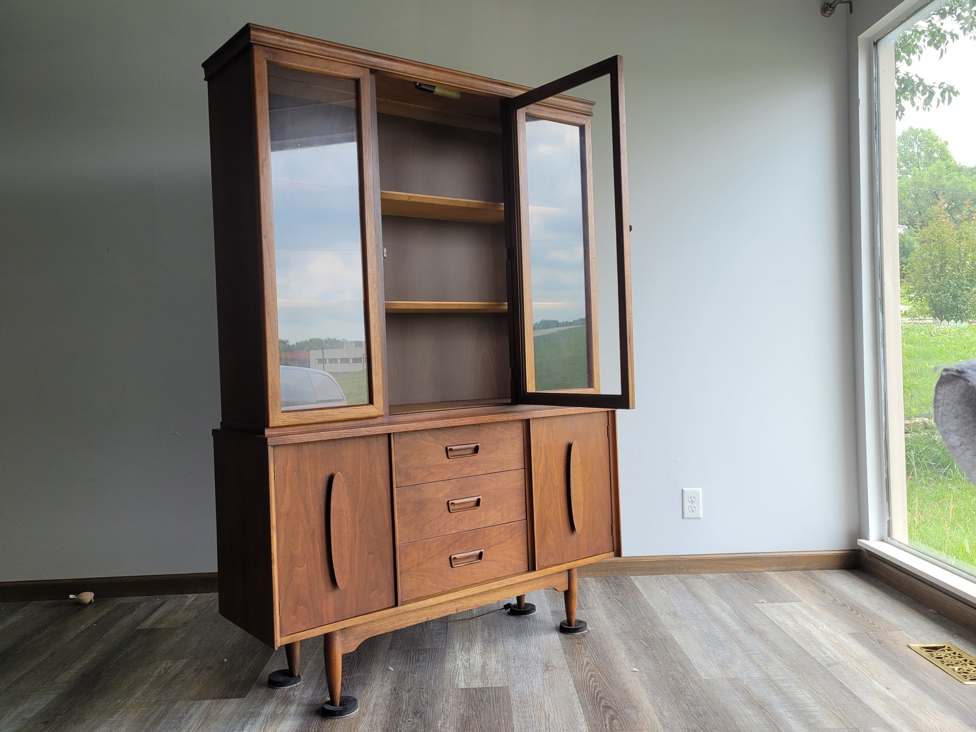 Walnut veneer hutch by Garrison Furniture Co - complete with a light! Beautiful original condition - minor touch up on a few veneer chips was all that was needed to restore it to its former glory! Don't think too long or you'll miss your chance - these pieces tend to sell faster than almost anything else I find!